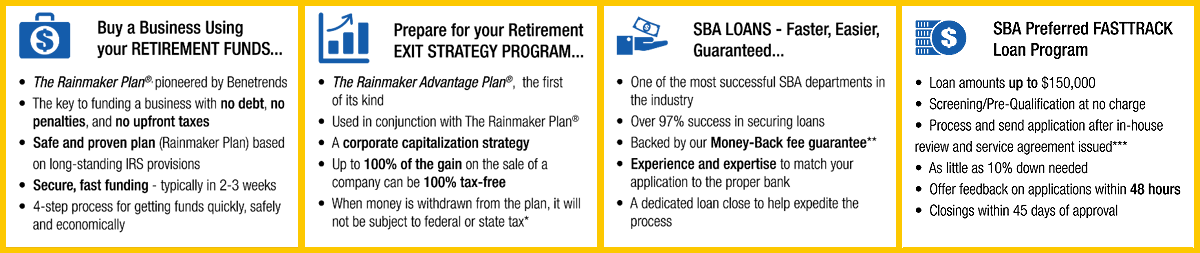Benetrends has been funding America's entrepreneurs for over 35 years, offering a comprehensive suite of funding options covering nearly every type of business situation. The most popular programs are the Rainmaker Plan®(IRA/Rollover) and SBA small business loan programs. And, they continue to provide innovative solutions, with their newest funding option, The Rainmaker Advantage Plan®. This corporate capitalization strategy is designed to mitigate or eliminate the taxes due on the sale of a business. Benetrends also offers Securities Backed Line of Credit and Equipment Leasing.